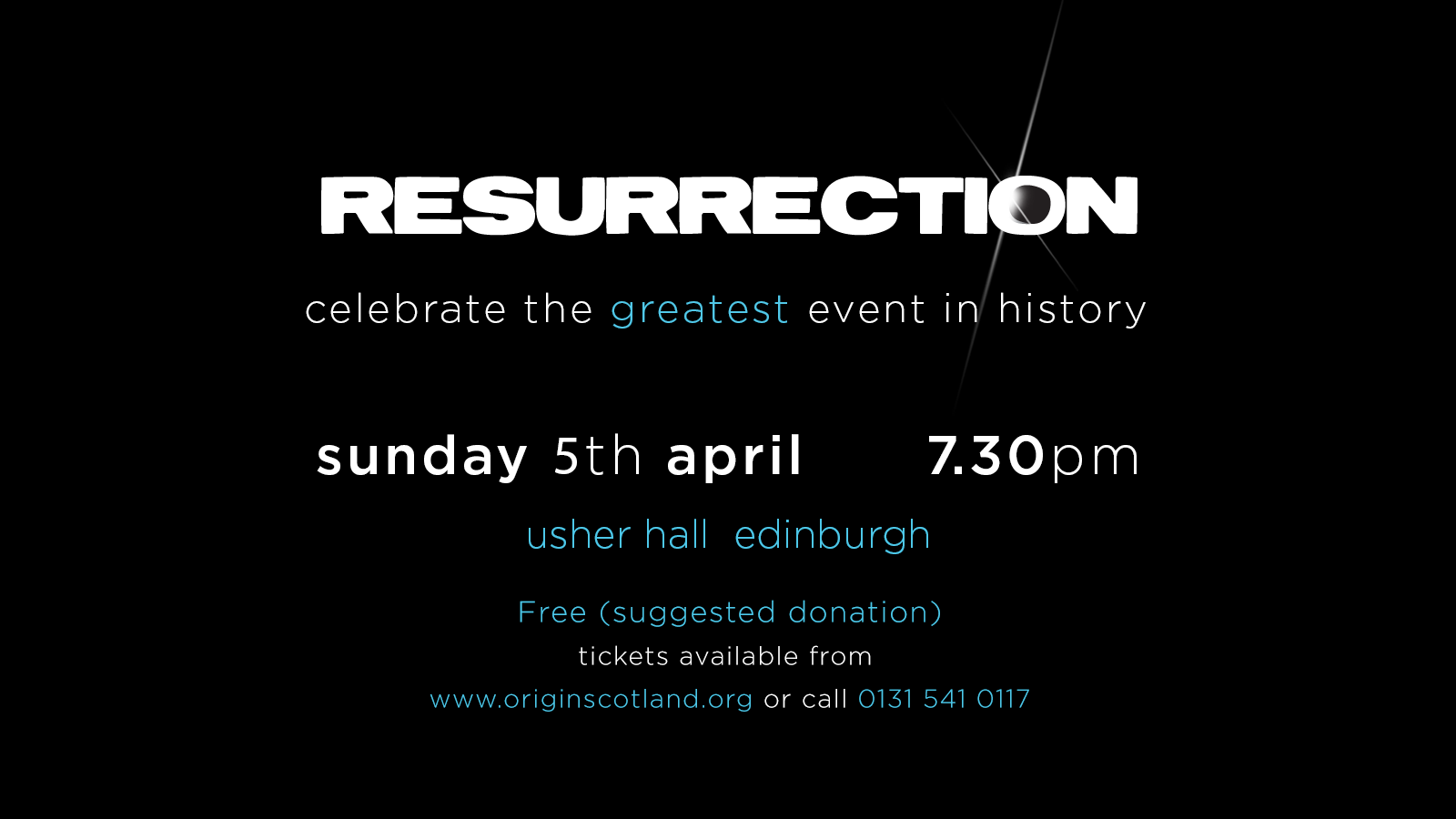 Join us for RESURRECTION, an event that has become an Easter tradition in Scotland, where Christians from across the central belt come together to celebrate the resurrection of Jesus through a powerful evening of music and worship.
